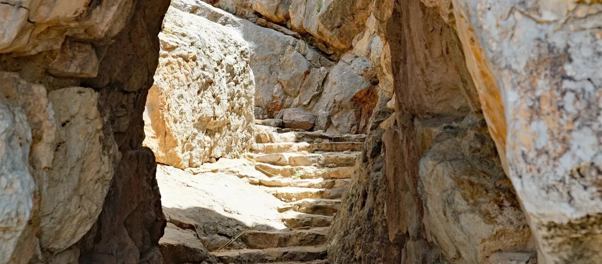 Der Weg zur Oberburg führt entlang der beeindruckenden Reste der Mauern, die einst die Unterburg vor Angriffen schützen sollten. Diese zyklopischen Mauern stammen aus dem 14. bzw. 13. Jahrhundert v. Chr.