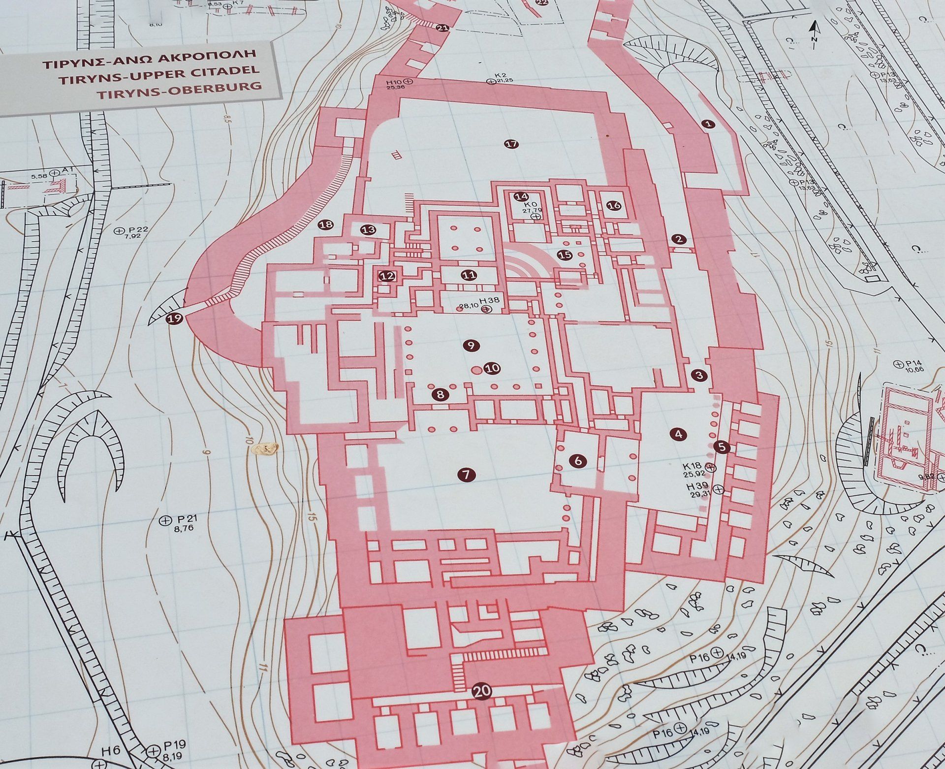 Die Oberburg: (1) Rampe, (2) Östliches Haupttor, (3) Tore, (4) Hof mit Säulenhalle, (5) Ostkasematten, (6) Großes Propylon, (7) Äußerer Palasthof, (8) Kleines Propylon, (9) Innerer Palasthof mit Säulenhallen, (10) Altar, (11) Großes Megaron, (12) „Badezimmer“, (13) Westliche Palasträume, (14) Kleines Megaron, (15) Frühhelladischer Rundbau, (16) Östliche Palasträume, (17) Mittelburg, (18) Westtreppenanlage, (19) Pforte, (20) Südkasematten, (21) Westtor, (22) Unterburg